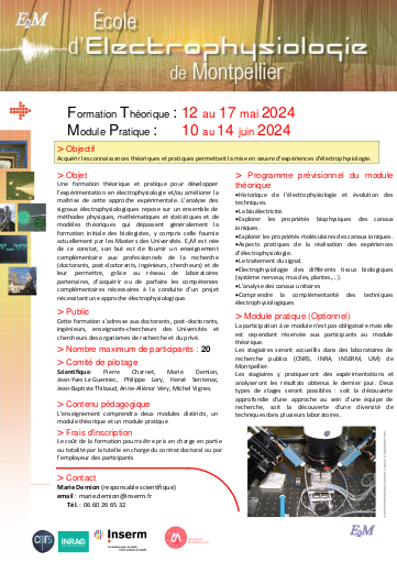 formation théorique et pratique pour développer l’expérimentation en électrophysiologie et/ou améliorer la maîtrise de cette approche expérimentale.L’électrophysiologie regroupe l’ensemble des techniques permettant la mesure et l’analyse des signaux électriques biologiques. L’électrophysiologie fait appel à une grande diversité d’approches expérimentales, qui vont de l’analyse d’une molécule unique à celle d’un organisme entier, elle nécessite un support théorique et un savoir-faire particulier. L’analyse des signaux électrophysiologiques repose sur un ensemble de méthodes physiques, mathématiques et statistiques et de modèles théoriques qui dépassent généralement la formation initiale des biologistes, y compris celle fournie actuellement par les Masters des Universités. Sur la base de ce constat, l’objectif de E2M est de fournir un enseignement complémentaire aux professionnels de la recherche (doctorants, post-doctorants, ingénieurs, chercheurs) et de leur permettre, grâce à son réseau de laboratoires partenaires, d’acquérir ou de parfaire les compétences nécessaires à la conduite d’un projet nécessitant une approche électrophysiologique.